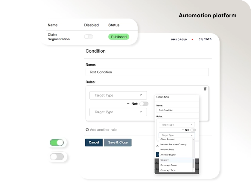 Create custom workflows for FNOL triage, claims routing, escalation triggers, and document validation. Automate actions based on geography, policy logic, value thresholds, or missing information - all configurable by partner or product. Round Robin assignment, real-time alerts, and API-triggered events are supported.